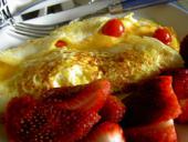 یک کاسه بلوری متوسط آماده کنید. سپس زردههای تخممرغ را به همراه شکر یا پودر قند در آن بریزید و با همزن برقی مولینکس خوب هم بزنید تامایه پف کرده و کمرنگ شود. حالا مایه را به خامه زده شده و وانیل اضافه کنید.در کاسه بلوری دیگری سفیدههای تخممرغ را با همزن به حدی بزنید تا سفید شود.برای امتحان کافی بودن میزان همزدن سفیدهها، ظرف را کج کنید. اگر سفیدهها بیرون نریخت یعنی به اندازه کافی سفت شده است. سپس سفیده را با دقت به مخلوط زرده تخممرغ و خامه و وانیل اضافه کنید . کره را در تابهای متوسط بریزید و آن را روی شعله اجاق گاز قرار دهید تا آب شود. سپس مخلوط مایه را در کره داغشده بریزید و شعله اجاقگاز را پس از گذشت 2 دقیقه کم کنید تا سطح زیرین مایه سرخ شود. حالا برشهای توت فرنگی را روی نیمهای از سطح تخممرغ داخل تابه بریزید و با استفاده از کفگیر، نیمه دیگر تخممرغ را روی توتفرنگیها برگردانید و به مدت 2 دقیقه، حرارتدادن را ادامه بدهید. به این ترتیب به همین راحتی املت توتفرنگی آماده سرو است.