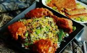 تکه های مرغ را بشورید و سپس درون ماهی تابه ای  روغن ریخته و مرغ ها را سرخ کنید.تا طلایی شود سپس پیاز و سیر خرد شده ، نمک ، نصف قاشق چایخوری زعفران و 1 لیوان آب اضافه کنید تا به مدت 2 ساعت بر روی حرارت ملایم بپزد.