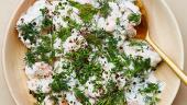 - در پایان سالاد را در ظرف سروتون کشیده، و روی آن را با شوید و پیازچه تزئین کنید. و کمی فلفل و روغن زیتون بزنید نوش جان