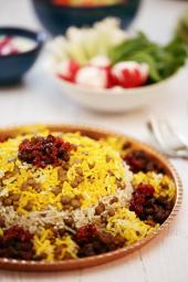 - بعد از دم کشیدن برنج آن را به ظرف سرو منتقل کنید و روی آن را با مخلوط گوشت، خلال هویج پخته و سرخ شده، خلال پسته و بادام، کشمش و خرما تزیین کنید.