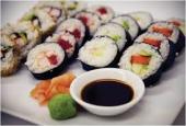 سوشي يک غذاي ژاپني است که در آن از جلبک دريايي استفاده مي شود.
