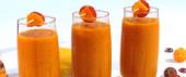 میوهها، هویج و آب پرتقال را درون دستگاه مخلوط کن مولینکس خوب با هم مخلوط کرده تا نرم و روان شوند ( ابتدا یک پیمانه آب پرتقال درون مخلوط کن بریزید و آن را مخلوط کنید سپس اگر جا داشت مابقی آن را درون دستگاه بریزید).