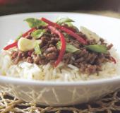 سپس گوشت چرخ کرده را اضافه کنید و با قاشق چوبی مرتب هم بزنید و بگذارید گوشت ها قهوه ای و خرد شوند 5-4 دقیقه این کار را ادامه دهید.بعد از 5 دقیقه مخلوط شکر را به تابه اضافه کنید و به مدت 30 ثانیه هم بزنید. غذای شما حاضر است ، برنج سرخ شده با نارگیل را در بشقابها بکشید و گوشت را روی آن بریزید و با کمی ریحان و فلفل قرمز تزئین کنید.