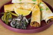 حالا مقداری از مرغ را در وسط نان های لواش می ریزیم، سپس پیاز، گوجه فرنگی و جعفری را خردکن مولینکس خرد می کنیم