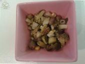 - کلم بروکلی را به قطعات کوچکتر تقسیم کنید، زیتونها و چاقاله بادام را از وسط نصف کنید، گوجه سبز رو چهار قاچ کنید، کرفس را باریک باریک حلقه ای کنید، خیار را هم با رنده مولینکس نگینی متوسط کنید.