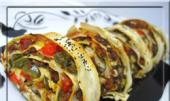 بعد از مایع شیر و روغن و سفیده تخم مرغ با قلمو روی خمیرها می مالیم . بعد مایه گوشتی که آماده کرده بودیم روی خمیر پخش می کنیم . و به همین ترتیب قارچها رو روی خمیر می ریزیم . و بعد فلفل دلمه ایها و در نهایت پنیر پیتزا بعد رولت رو رول می کنیم