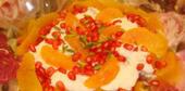 آب ، پرتقال را با آبمرکبات گیری مولینکس گیرید . پنیر را به مدت نیم الی سه ربع ساعت در آب گذاشته تا بی نمک شود . پرتقال ها را طوری پوست بکنید که به گوشت پرتقال برسد بعد هر قاچ پرتقال رابا کارد دانه دانه جدا کنید . نیمی از انار های دانه شده و پرتقال را در دیس بریزید و آب پرتقال هم بریزید سپس خامه و پنیر و وانیل و شکر را میکس کرده و اضافه کنید و دو باره با انار و پرتقال و با تزئینی از پسته روی خامه را بپوشانید.