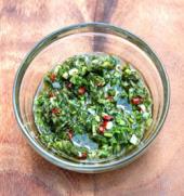 جعفری، سیر، فلفل قرمز، پونه، آب لیمو ترش و روغن زیتون را داخل دستگاه مخلوط کن مولینکس بریزید و با هم ترکیب کنید. سپس نمک را اضافه کنید تا سس یکدست شود.