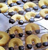 حالا سینی رو داخل فری که از قبل با دمای 175درجه سانتی گراد گرم شده قرار بدید و صبر کنید تا زیر شیرینی کاملا طلایی بشه ولی روش نیازی نیست خیلی تغییر رنگ بده.وقتی شیرینی پخت اون رو خارج کنید و نیم ساعت داخل یخچال بذارید تا سرد شود. مقداری شکلات رو آب کنید و نوک نعلها رو داخل شکلات قرار بدید و دوباره بذارید در یخچال تا شکلات ببنده.