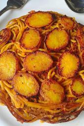 - پس از اینکه ماکارونی ها را آبکش کردید کف قابلمه را روغن بریزید و سیب زمینی ها را در آن بچینید و کمی به سیب زمینی ها نمک بزنید و مقداری از ماکارانی را روی سیب زمینی ها بریزید و بعد کمی از سس را روی ماکارانی ها بریزید