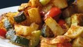 یک ماهیتابه متوسط آماده میکنیم و بر روی اجاق گاز قرار میدهیم و کدو سبز ، سیب زمینی ، فلفل قرمز ، سیر ، خرده نان و روغن زیتون و تفت میدهیم و به اندازه مورد نیاز نمک ، فلفل و فلفل سیاه اضافه میکنیم و مدت کوتاهی تفت میدهیم.