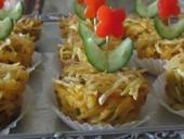 قالب کاپ کیک را با قلم مو چرب و بعد با مواد پر کنید . سیب زمینی رنده شده به وسیله رنده برقی مولینکس را سرخ کرده و روی مواد بریزید و روی قالب را با فویل پوشانده در فر به مدت نیم ساعت بگذارید .