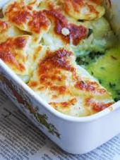 لایه بعدی مجدد سیب زمینی حلقه شده ، سس سفید ، اسفناج و پنیر بریزید ، لایه آخر باقی مانده سیب زمینی حلقه شده بچینید و روی آن باقی مانده پنیر را بریزید و در فر با دمای 200 درجه سانتیگراد 50 – 60 دقیقه بگذارید تا گراتن آماده شود ( با چنگال پخته شدن سیب زمینی را چک کنید ).
