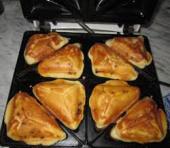 سپس نان را همانند شکل به صورت مثلث تا می زنیم و اطراف آن ها را به کمی کره آغشته کرده و در دستگاه ساندویچ ساز مولینکس قرار می دهیم و در دستگاه را می بندیم و به مدت 8 دقیقه صبر میکنیم تا سمبوسه ها کاملا برشته و اماده شوند.
