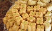 حالا خمیر آماده شده رو روی سطح چرب شده به قطردلخواه پهن کنید.روی خمیر قالب بزنید یا اینکه اونو قلقلی کنید و روی هر کدوم از شیرینی ها مقداری پودر پسته یا خلال قرار بدید.داخل سینی فر کاغذ روغنی بندازید و شیرینی ها رو داخلش بچینید.فر رو از قبل 10 دقیقه با دمای 180 درجه سانتی گراد گرم کنید و سینی رو 35تا40 دقیقه داخلش قرار بدید.