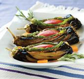 ابتدا بادمجان ها را شسته و بعد به صورت راه راه پوست کنده و نمک بزنید و داخل آبکش قرار دهید تا آب تلخ بادمجان ها خارج شود، مجدد با آب سرد بشویید و خشک کرده و داخل روغن سرخ نمایید. سپس بادمجان سرخ شده را کنار بگذارید تا کاملا روغن آن گرفته شود. فلفل سبزها را کبابی کنید تا کمی نرم شوند و سپس فلفل ها را از طول برش داده و دانه های آن خارج نمایید.