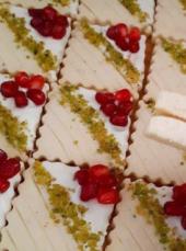 - در آخر بیسکوئیت ها را با شکلات سفید آب شده و پود پسته و دانه های انار تزئین کنید نوش جان