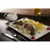 بعد اجازه بدید کمی خنک بشه و پوست روش رو بکنید. راحت جدا می شه.حالا باید اون رو با چاقو به برش های دلخواه تقسیم کنید.و داخل تابه ای کمی کره بریزید و بگذارید تا دو طرفشون توی کره تفت بخوره و کمی تغییر رنگ بده.قارچ هاتون رو که بهتره مرغوب و سفید باشند رو با رنده مولینکس ورقه کنید و با کمی کره جداگونه تفت بدید تا ابش جمع بشه.آرد رو با مقداری روغن تفت بدید تا خامی اش گرفته بشه و بعد کم کم بهش شیر رو اضافه کنید. همینطور فلفل سفید و نمک رو.ریختن فلفل سفید بخاطر اینه که رنگ سفید سس حفظ بشه وگرنه فلفل قرمز یا سیاه هم میتونید استفاده کنید. بعد از ریختن شیر اجازه بدید تا سس قوام بیاد و اگه مایل بودید بهش کمی خامه اضافه کنیدو در نهایت قارچها رو اضافه سس کنید و زیرش رو خاموش کنید. خوراک رو توی دیس بکشید و اطرافش رو سس بدید.