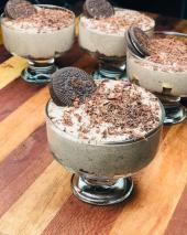 - در ابتدا چند عدد بیسکوئیت oreo یا هر بیسکوئیتی که دوست دارید برای تزئین روی دسرتون کنار بگذارید ما بقیه بیسکوئیت ها را با غذاساز مولینکس میکس کنید و مقداری از بیسکوئیت خرد شده را کنار بگذارید.