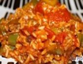 ابتدا فلفل دلمه ای ها را پاک کرده و خرد کنید. پیاز را پوست گرفته و خردکنید.گوشت را با آب سرد بشویید و خورشتی خرد کنید یا چرخ كنید( به وسیله چرخ گوشت مولینکس ). روغن را در تابه ای داغ کرده و گوشت را در آن تفت دهید. سپس پیازها را نیز اضافه کرده و تفت دهید. رب گوجه فرنگی را اضافه کرده نمک و فلفل بزنید. 250 میلی لیتر آب سبزیجات به آن اضافه کنید و بگذارید با درب بسته یك ربع بپزد.فلفل دلمه ها و برنج شسته شده را به آن اضافه کرده و مابقی آب سبزیجات را نیز اضافه کنید و 20 دقیقه دیگر غذا را در ظرف دربسته بپزید.گوجه فرنگی ها را بشویید و برش کوچکی روی آن ها ایجاد کنید. یک دقیقه در آب داغ بیندازید و خارج کنید، سپس پوست بگیرید و خرد كرده و به مواد اضافه كرده و هم بزنید. بگذارید غذا 5 دقیقه دیگر بپزد. پلو را نمک و فلفل بزنید و با ریحان سرو کنید.