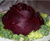 ابتدا کلم سفید، کلم قرمز، آناناس و گردو را خرد کنید. سپس هویج را با رنده برقی مولینکس رنده کنید ،کشمش پلویی، سس مایونز و نمک و فلفل را به آن اضافه کرده وباهم مخلوط کنید. و درون یک ظرف بریزید،سعی کنید آن را کمی گنبدی کنید اما نه زیاد. سپس لبو را با رنده برقی مولینکس ورقه ای کرده . اولین برش را لوله کنید و در بالای سالاد قراردهید. سپس بقیه رابه دور لایه اول بپیچید. سپس لایه های زیری را روی لایه ها بالایی قراردهید و سعی کنید به شکل گلبرگهای کل درآورید.