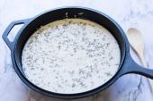 آرد را نیز اضافه کرده و حدود یک دقیقه تفت دهید بعد از آن شیر را به همراه نمک و فلفل سیاه کم کم اضافه کرده و با سری همزن گوشت کوب برقی مولینکس هم بزنید تا گلوله گلوله نشود.