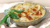 کف ظرف مخصوص فر یا پیرکس را چرب و سیبزمینیها را حلقه حلقه کرده و در آن بچینید. قارچ را خرد کرده و با تخممرغها بزنید. پنیر سفید و کمی از پنیر پیتزای رندهشده را هم اضافه کرده و هم بزنید. خامه، ریحان، نمک، فلفل و نشاسته را هم افزوده و کاملا با غذاساز مولینکس مخلوط کنید. این مایه را روی سیبزمینیها ریخته و صاف کرده و دوباره یک لایه سیبزمینی حلقه شده را روی مواد بچینید. کمی روغن زیتون روی سیبزمینیها ریخته و در فر از قبل گرم شده با حرارت 170 درجه سانتیگراد به مدت 20 الی 30 دقیقه قرار دهید. بعد از این مدت پنیر پیتزا باقیمانده را روی سوفله ریخته و مجددا پنج دقیقه دیگر در فر قرار داده تا پنیر طلایی شود.