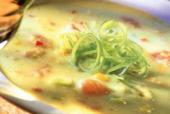 آب مرغ، شیر و سبزیجات لهشده و باقیمانده سبزیجات تفت داده شده را نیز در قابلمه بریزید و 3 الی 4 دقیقه دیگر حرارت دهید. سپس آن را به ظرف مورد نظر برای سرو بریزید و با ترهفرنگی خلال شده سرو کنید.