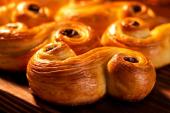 4. در دو سمت شیرینی سوئدی یک عدد کشمش قرار دهید و تخم مرغ زده شده را به وسیله برس روی خمیر بمالید.