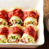 فر را با دمای 180 درجه سانتی گراد روشن کنید. نیمی از سس را داخل ظرف موردنظرتان بریزید سپس لازانیاهای لوله شده را داخل آن مانند شکل قرار دهید. روی ظرف را با فویل بپوشانید و آن را به مدت 30 دقیقه داخل فر قرار دهید. فویل را بردارید و ظرف را مجدد به مدت 10 دقیقه داخل فر قرار دهید سپس آن را با مابقی سس سرو کنید.