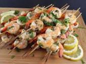 میگوها را به سیخ چوبی بکشید ( سیخ ها را 30 دقیقه پیش از کار در مقداری آب خیس دهید تا نسوزد ) ، میگوها را روی کباب پز قرار دهید و با روغن زیتون روی انها برس بکشید.