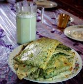 سپس سطح کار را آرد پاشی میکنیم تا خمیر به آن نچسبد.بعد با کمک وردنه خمیر را باز میکنیم تا کاملا نازک شود. در حدی که فقط پاره نشود.بعد پیازچه ها را در نیمی از قسمت خمیر یعنی یک طرف نیم دایره خمیر بریزید و نیمه دیگر خمیر را روی آن برگردانید و لبه های خمیر را با کمی فشار دست ببندید.برای پخت این نان باید از ساج استفاده کرد که اگر در دسترس نبود میتوانید از ماهیتابه یا سینی فر استفاده کنید و آن را برگردانید و روی حرارت قرار دهید تا گرم شود. حرارت را طوری تنظیم کنید که ساج خیلی داغ نشود که باعث خشکی نان شود.بعد خمیر نان را روی آن قرار دهید. وقتی یک طرف نان پخت و خال های قهوه ای زد ، طرف دیگر آن را برگردانید تا بپزد.بعد از اینکه نان پخت ، آن را برش بزنید و روی آن کره حیوانی بمالید و در کنار دوغ میل کنید. نوش جان