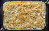 ماکارونی و آبی که نگه داشته بودید را به ترکیب اضافه کرده و مخلوط کنید و سپس ترکیب را به ظرف پخت منتقل نموده خرده نان ها را رویش بپاشید و به مدت 20 – 25 دقیقه در فر بگذارید تا کاملا طلایی و برشته شود.