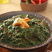 مقداری آب و نمک را جوش آورده و اسفناج را در آب جوش برای 1 دقیقه بپزید تا نرم شود. اسفناج را آبکش کرده و کنار بگذارید. سپس در ظرفی مناسب روغن مایع را داغ کرده و پیاز را کمی تفت دهید تا نرم و شفاف شود. زنجفیل را اضافه کرده در ادامه به آن سیر بیفزایید. کمی که مخلوط تفت داده شد دو قاشق سوپ خوری آب اضافه کرده زرد چوبه پودر زیره ، پودر گشنیز و نیمی از پودر گرام ماسالا را اضافه کنید. مخلوط را تفت دهید تا آب آن کشیده شود. سپس گوجه فرنگی و فلف سبز را اضافه کنید، حرارت را کم کرده و برای چند دقیقه پخت را ادامه دهید تا مخلوط پخته شود. سپس اسفناج را اضافه کنید و کمی تفت دهید. ظرف را از روی شعله برداشته و اجازه دهید کمی خنک شود. سپس کم کم در دستگاه 3-2-1 مولینکس ریخته و تا جایی که ممکن است پوره کنید.