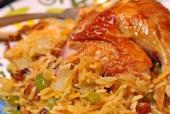 5. در ظرف سرو ابتدا پلوی ساده را كشیده، تكههای مرغ را بر روی آن قرار داده و مخلوط كشمش و برنج را روی آن میدهیم و سرو مینماییم.